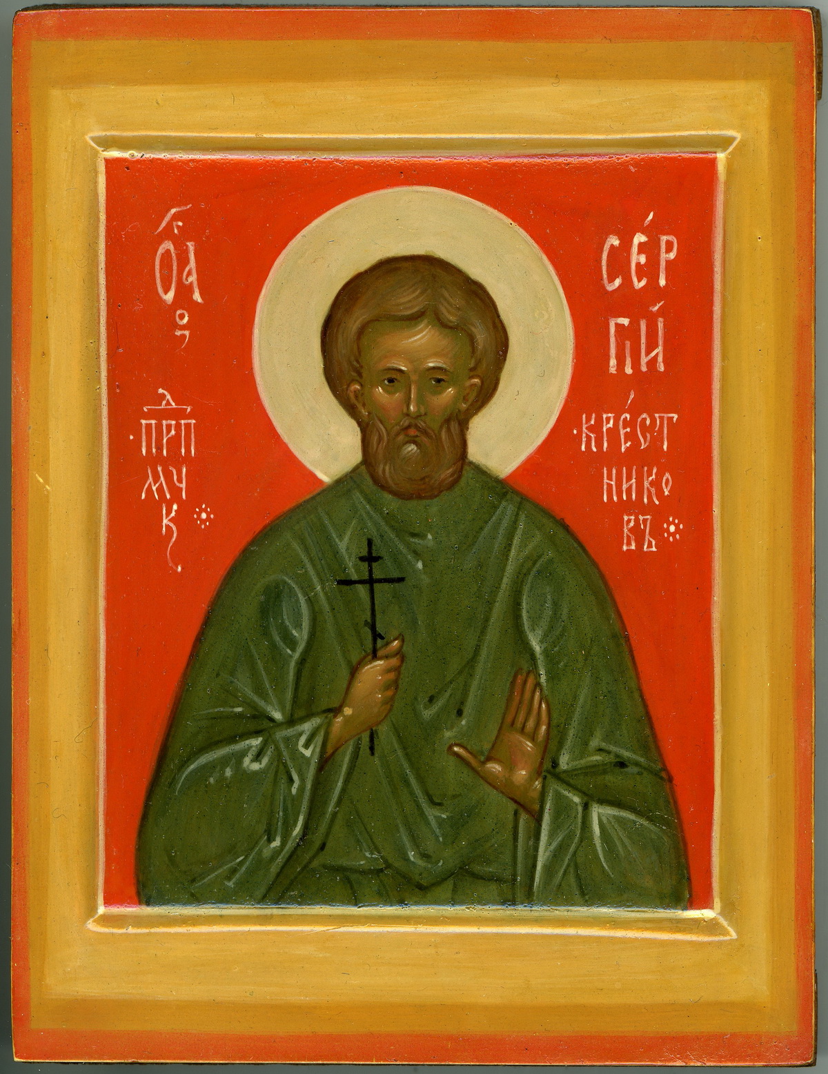 Преподобномученик Сергий (в миру Сергей Александрович Крестников) родился 1 июля 1893 года в городе Москве в семье рабочего. Окончил церковно-приходскую школу. В 1905 году, когда Сергею исполнилось двенадцать лет, он был принят в хор московского Покровского монастыря и оставался певчим этого хора до 1915 года. Затем в течение двух лет пел в московских храмах. В 1918 году поступил послушником в Троице-Сергиеву Лавру. Ночью 3 ноября 1919 года все храмы и келии Лавры были опечатаны, а братию выселили в Гефсиманский скит. В скиту послушник Сергий оставался до 1922 года, а затем стал регентом и псаломщиком Пятницкой церкви в городе Сергиеве. После закрытия церкви, в мае 1928 года, послушник Сергий перешел в храм Всех святых на Кокуевском кладбище, где был погребен преподобный Алексий Зосимовский. Сергий не только пел в церковном хоре, но и нес послушание сторожа. Впоследствии он был избран председателем церковного совета храма. Как и многие из братии перед закрытием обители, поддерживал духовную связь с последним наместником Лавры, архимандритом Кронидом (Любимовым), который с 1929 года проживал неподалеку от Кокуевского кладбища.