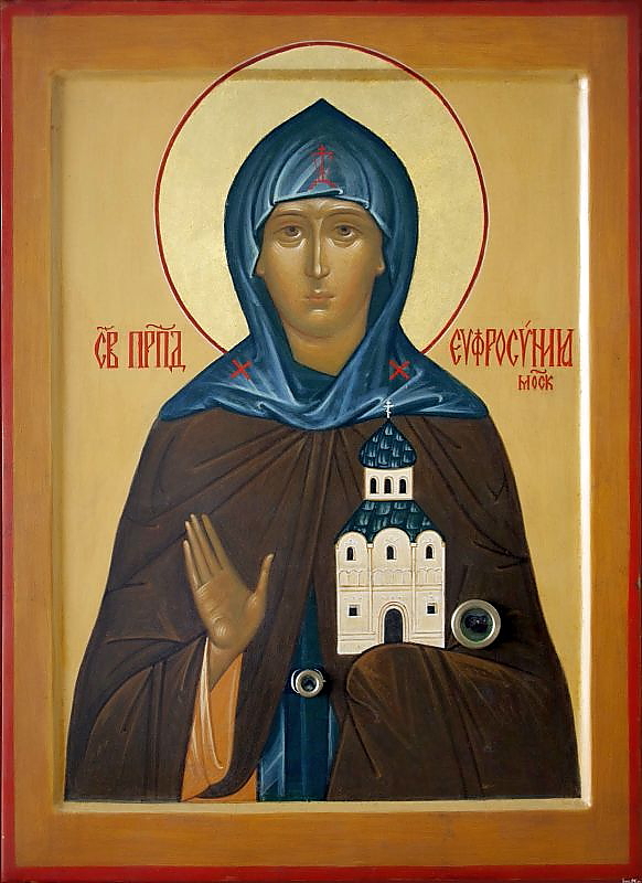 Преподобная Евфросиния, в миру Евдокия, вел. кн. Московская († 1407), супруга князя Дмитрия Донского и собеседница преподобного Сергия Радонежского, который крестил в своем монастыре двух княжеских сыновей. Племянник старца прп. Феодор Симоновский был духовником княжеской четы. После смерти мужа княгиня творила дела милосердия. Приняла постриг в Вознесенском монастыре Кремля, который основала там, где провожала и встречала супруга с Куликова поля.