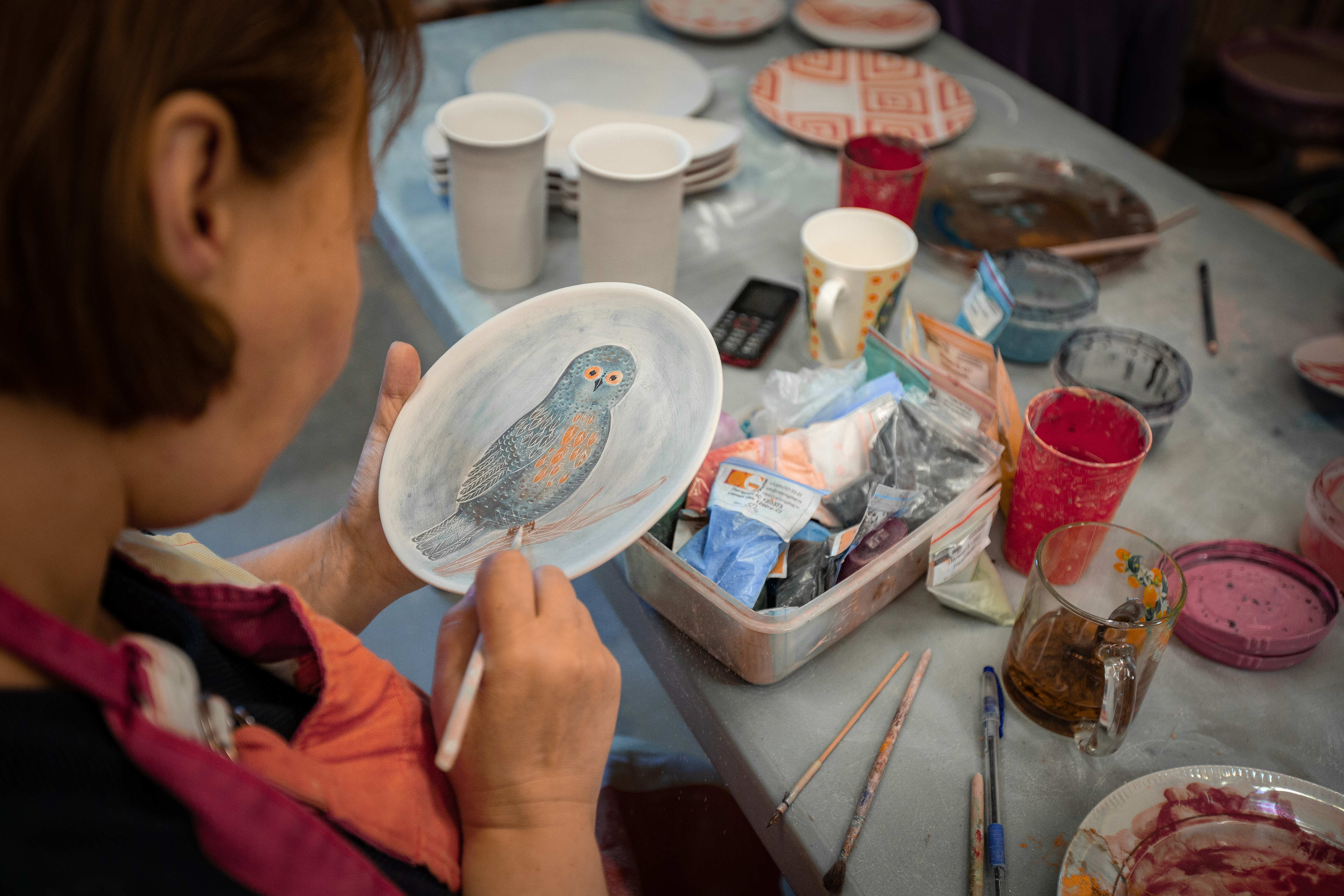 Следующим заданием стало собрать сделанные детьми детали воедино на большой тарелке. Под руководством Ольги дети промокали нижнюю сторону изделий кисточкой, чтобы сделать ее липкой, и размещали детали на заготовке.