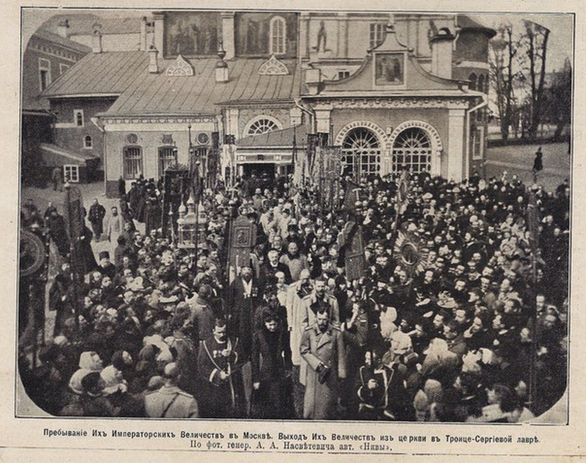 Из Троицкого собора при пении «Спаси Господи» Их Величества последовали в Серапионову палатку и Никоновскую церковь, где прикладывались к святыням, а затем направились через южные двери на монастырскую площадь…» [10] Официальные сообщения сообщают о разных встречах с представителями местного гражданского управления, которые для нас не столь важны, и мы их упускаем из вида.