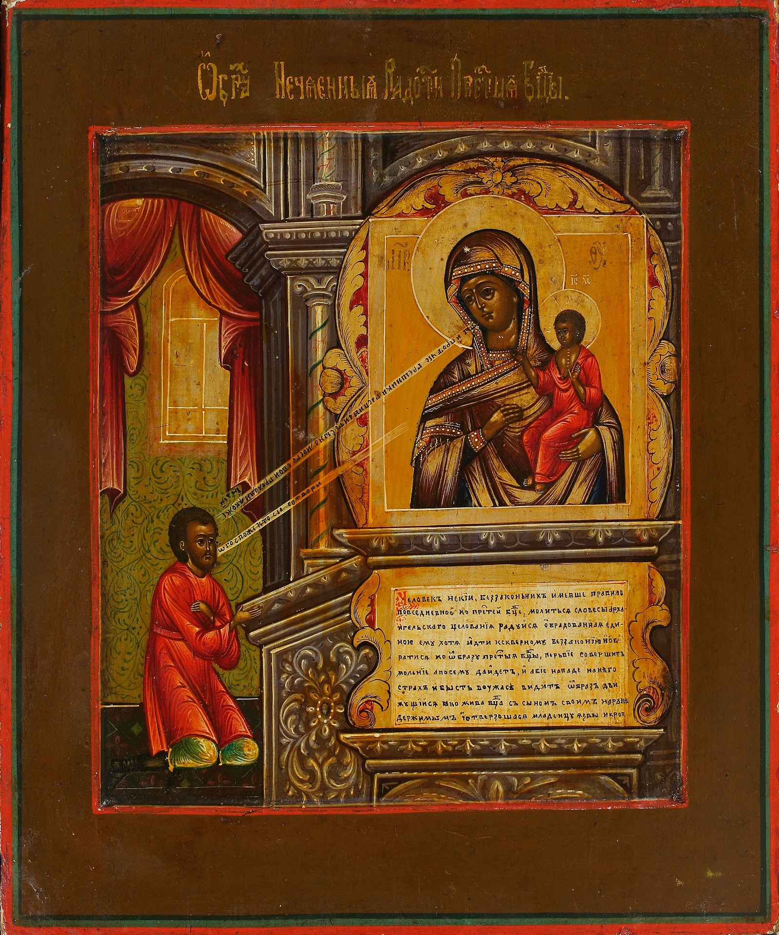 Днесь, ве́рнии лю́дие, духо́вно торжеству́ем,/ прославля́юще Засту́пницу усе́рдную ро́да христиа́нскаго,/ и притека́юще к пречи́стому Ея́ о́бразу, взыва́ем си́це:/ о, Преми́лостивая Влады́чице Богоро́дице,/ пода́ждь нам неча́янную ра́дость,/ обремене́нным грехи́ и скорбьми́ мно́гими,/ и изба́ви нас от вся́каго зла,// моля́щи Сы́на Твоего́, Христа́ Бо́га на́шего,/ спасти́ ду́ши на́ша.
