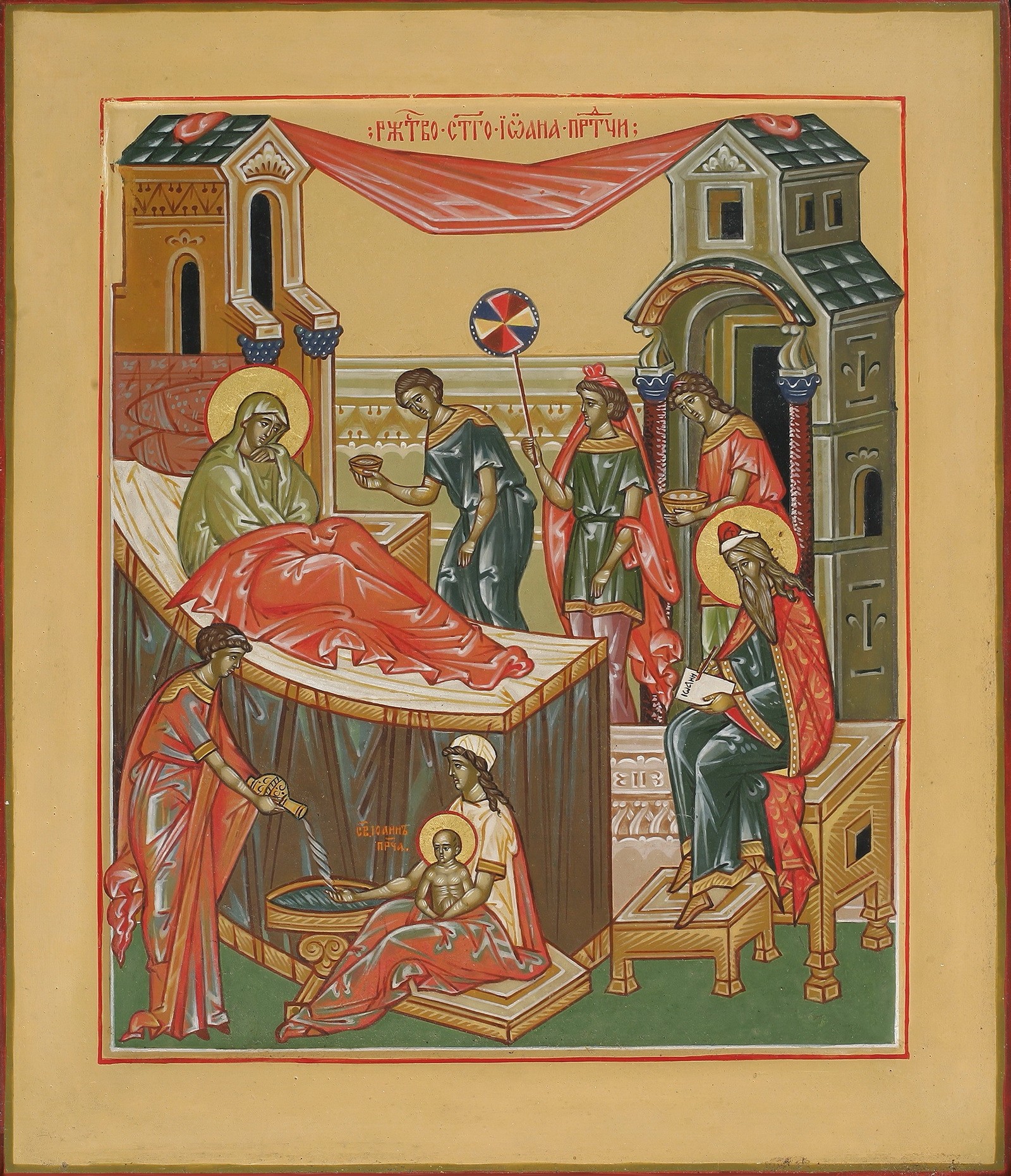 Настало время, и святая Елисавета родила сына, все родственники и друзья радовались вместе с ней. На восьмой день по закону Моисееву совершилось его обрезание. Мать назвала его Иоанном. Все были удивлены, так как никто в их роде не носил этого имени. Когда спросили об этом святого Захарию, он попросил дощечку и написал на ней: «Иоанн имя ему» – и тотчас связывавшие по предсказанию Архангела его речь узы разрешились, и святой Захария, исполнившись Духа Святого, прославил Бога и произнес пророческие слова о Явившемся в мир Мессии и о своем сыне Иоанне – Предтече Господа.