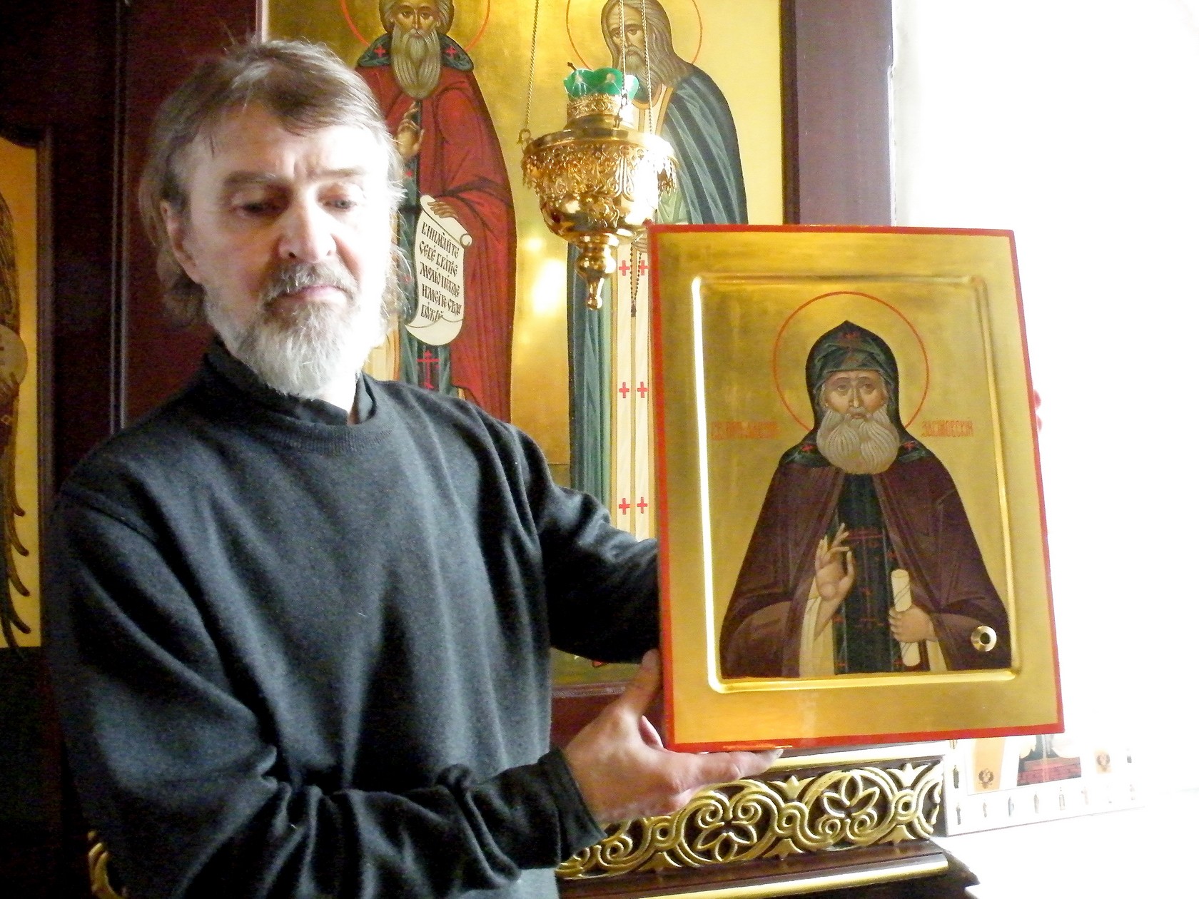 Владимир Подольский - пономарь, он же и иконописец. Учился этому ремеслу в художественном училище в Дубне. У Владимира есть благословение настоятеля отца Сергия писать иконы святых-новомучеников, которые когда - либо служили в этом храме. Первая уже написана - это икона преподобного Алексия Зосимовского (Соловьева, + 1928 г.). Знаменитый на всю Россию старец Алексий (в миру Феодор Алексеевич Соловьев) в 1917 году был избран членом Всероссийского Поместного Собора. Ему было предоставлено почетное право в храме Христа Спасителя вынуть жребий, определивший избрание митрополита Московского Тихона Белавина на Московский Патриарший престол. Преставился преподобный старец-затворник 19 сентября (2 октября по н.ст.) 1928 года на 83-м году жизни. Чин отпевания в Петро-Павловском храме был совершён архиепископом Бийским Иннокентием (Соколовым) с многочисленным сонмом клириков и иерархов. Погребён старец был у алтаря Всехсвятского храма (позже, по закрытии Кукуевского кладбища, перенесён на новое городское кладбище). На его могилку часто приходил помолиться настоятель дореволюционной Лавры преподобномученик архимандрит Кронид (Любимов). В 25 июля 1994 года святые мощи иеросхимонаха Алексия были обретены нетленными и покоятся сейчас в Смоленско-Зосимовой пустыни. А на месте его первого захоронения за алтарем Всехсвятской церкви сооружен памятный крест, в самом храме для поклонения верующим установлена икона с частицей мощей этого святого. Сейчас Владимир Подольский пишет такую же икону, но большего размера, для установления ее на памятном кресте.