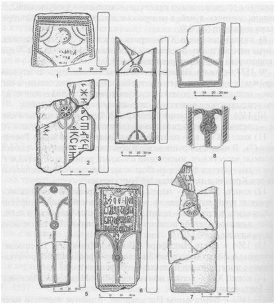8) вторая половина XVI—первая половина XVII в. — изножье плиты неизвестного. В жгутовом нижнем клейме, в центре — крест с короткими широкими рукавами (ил. 4:3);