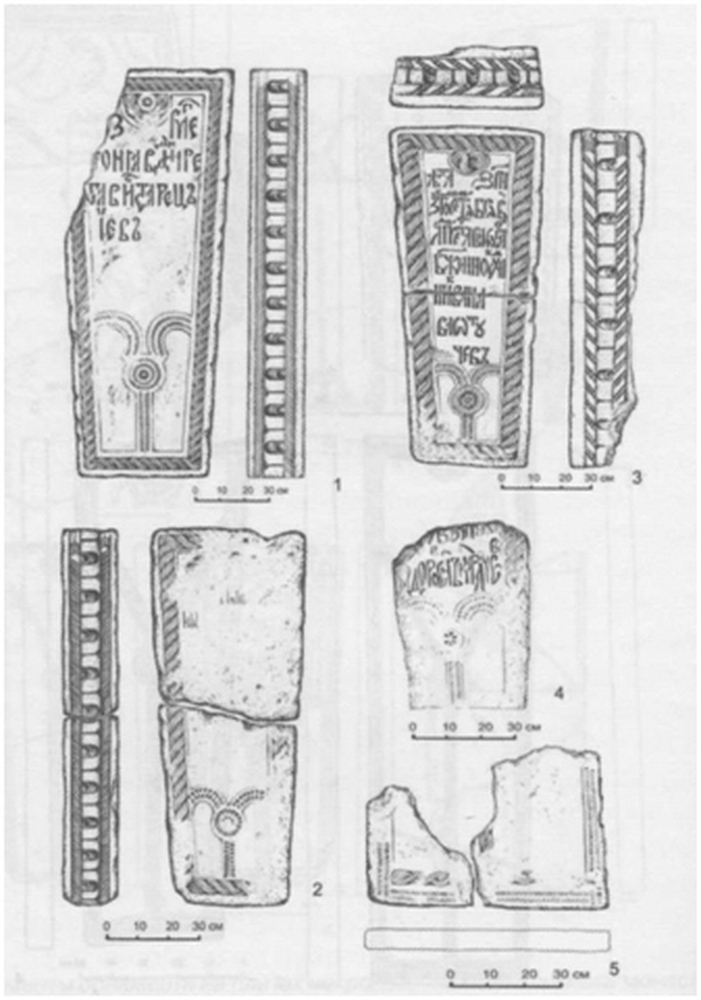 2. «Дополнительные орнаментальные ленты», дугообразные или прямые, примыкающие в изножье к основанию нижней прямой тяги («штока»). Их трактуют как основание Голгофе кого креста с позёмом, подобные есть на плите 1538/39 гг. из Спасо-Пребраженского Угрешского монастыря [2]. В Троице-Сергиевом монастыре найдено два изножья надгробий: одно с дугами (ил.1:3) [3] и одно с прямыми «лентами», приподнятыми от края изножья (ил.1:4)[4]. По московским аналогиям могут быть датированы второй четвертью XVI в.