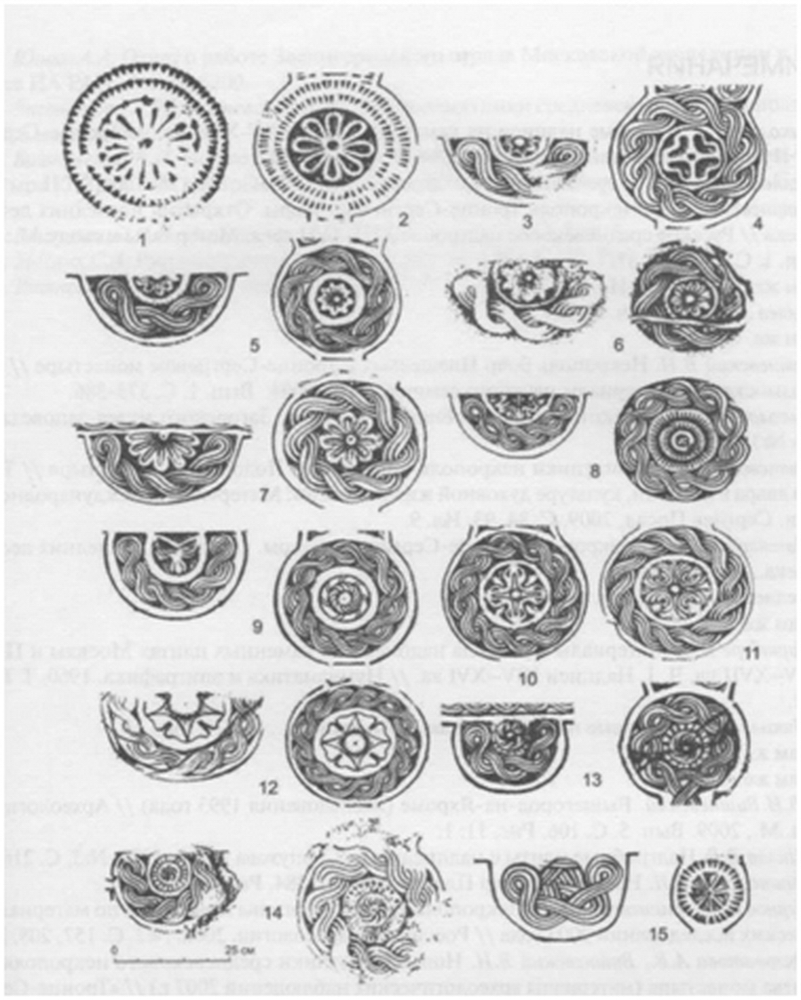 Таким образом, наряду с традиционными заполнениями клейм («розетка из лучей-треугольников» и «сегнерово колесо») существуют розетки в виде цветков с треугольными закругленными лепестками. Появляются они в начале XVI в. и существуют как исключения в первой половине XVI в. в геометрических композициях, затем в середине XVI в. появляются в жгутовых композициях и встречаются всю вторую половину XVI в. В конце XVII в. в заполнении цветочных клейм используются мотивы, аналогичные узорам архитектурных изразцов.