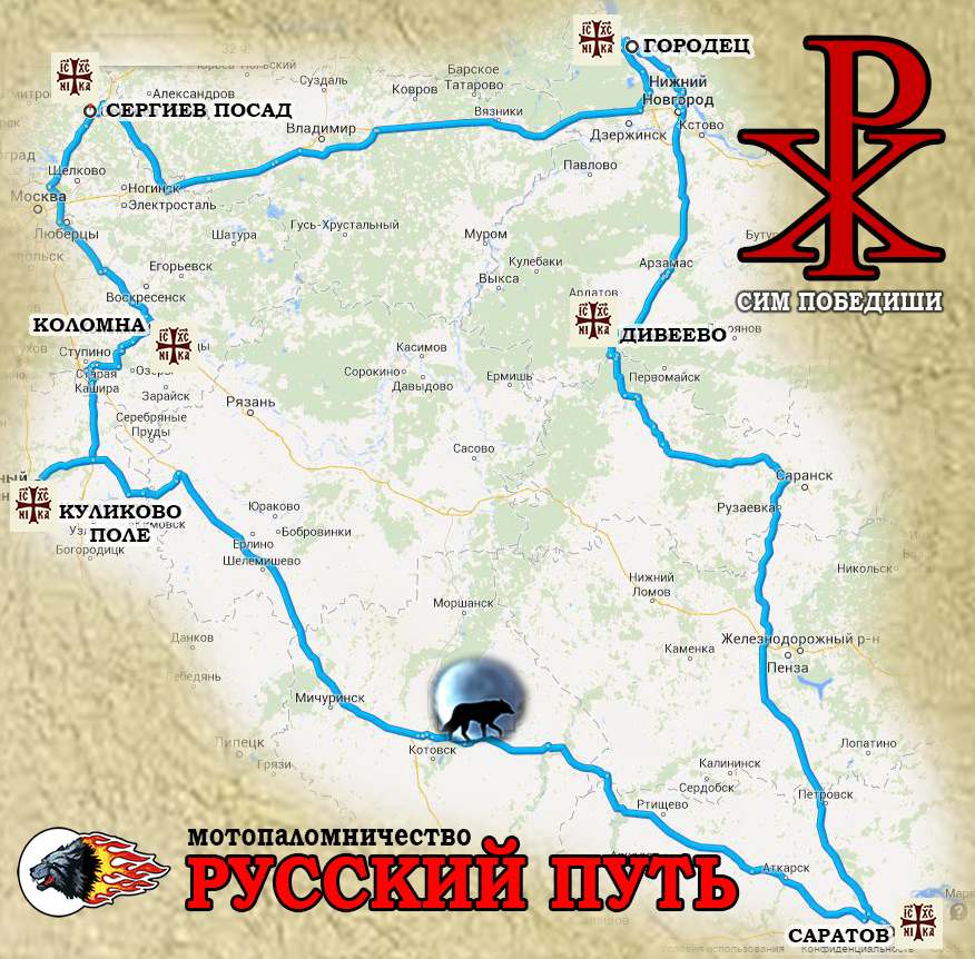 Мотопаломники совершат путешествие по городам - центрам Русского православия: Дивеево (Серафимо-Дивеевский монастырь) – Городец (Федоровский монастырь) - Сергиев Посад (Свято-Троицкая Сергиева Лавра) – Коломна – Куликово поле, помолятся у мощей великих Русских Святых — Духовных Отцов: преподобного Серафима Саровского, преподобного Сергия Радонежского, святых воинов Александра Невского и Димитрия Донского.