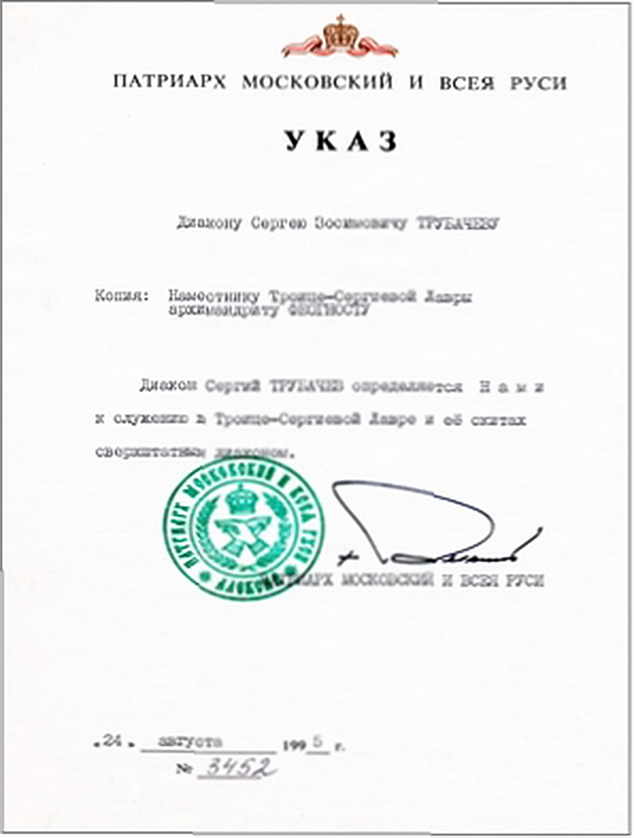 Указ Святейшего Патриарха Алексия II о служении Сергия Трубачева диаконом