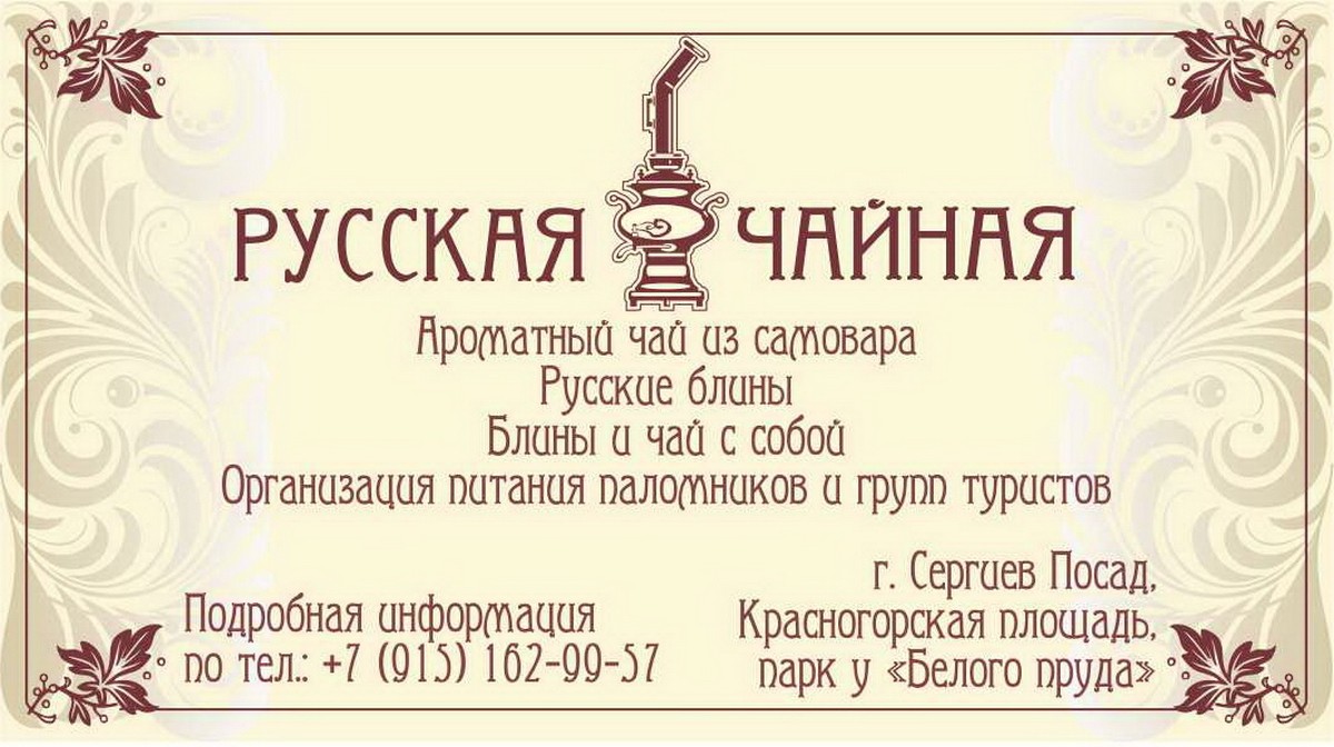 Ароматный чая из русского самовара, вкуснейшие блины «с пылу с жару», которые выпекаются в Вашем присутствии; большой выбор варенья и меда; удобная экологическая одноразовая деревянная посуда, и главное - сама чайная церемония на свежем воздухе, в беседке у стен Троице-Сергиевой Лавры, оставляют самые приятные впечатления.