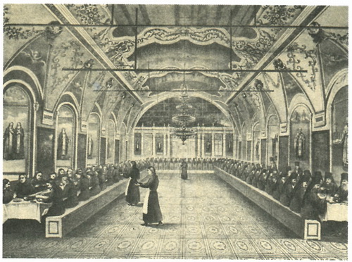 Угощение богомольцев во дворе лаврской трапезной палаты.