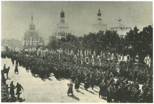 По словам очевидца «величественную картину представляла в это время площадь перед Лаврою. Несметные массы народа покрывали не только самую площадь, но и все улицы, лежавшие на пути московского крестного хода; крыши домов и лавок были унизаны народом; на пути шествия стояли войска; торжественно звучал музыкальный гимн «Коль славен наш Господь в Сионе» [9].