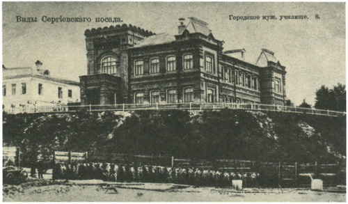 Мужское училище двухклассного состава было открыто в Посаде в 1860г. Не имея собственного здания, оно многие годы помещалось в частном доме вблизи Вознесенской площади, за аренду которого Посад платил немалые деньги. В 1898г., благодаря стараниям посадского старосты Н.Ф. Каптерева и при поддержке всего посадского общества, на горе Волкуше было заложено новое здание мужского училища, законченное в 1900г. В 1900г., после переезда в новопостроенное здание, мужское училище Посада было преобразовано в четырехклассное. Возможно, тогда же оно было названо «Троице-Сергиевским».