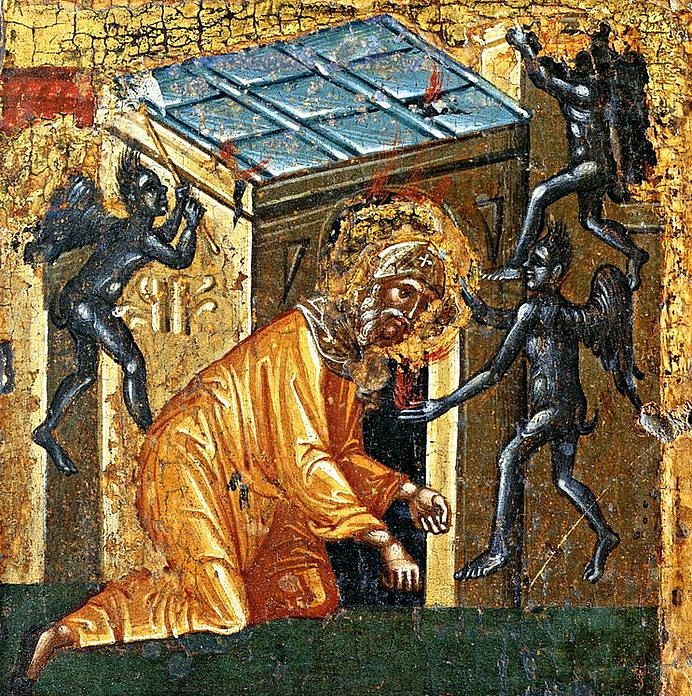 Богу угодно было утаить от святого старца притворство бесовское, и преподобный принял пришельца за простого человека, и с участием спросил его: «О чем ты так плачешь, что и мое сердце сокрушаешь своими горькими слезами?» Бес отвечал: «Отец святой! Я не человек, а просто бес по множеству беззаконий моих!»