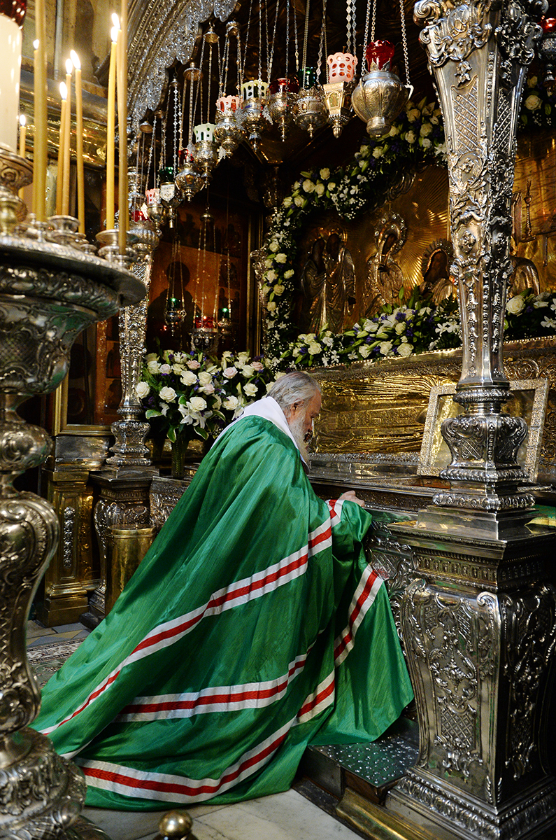 Предстоятель Русской Православной Церкви проследовал в древний Троицкий собор, где поклонился честным мощам преподобного Сергия Радонежского, а затем возглавил служение малой вечерни с чтением акафиста Преподобному.