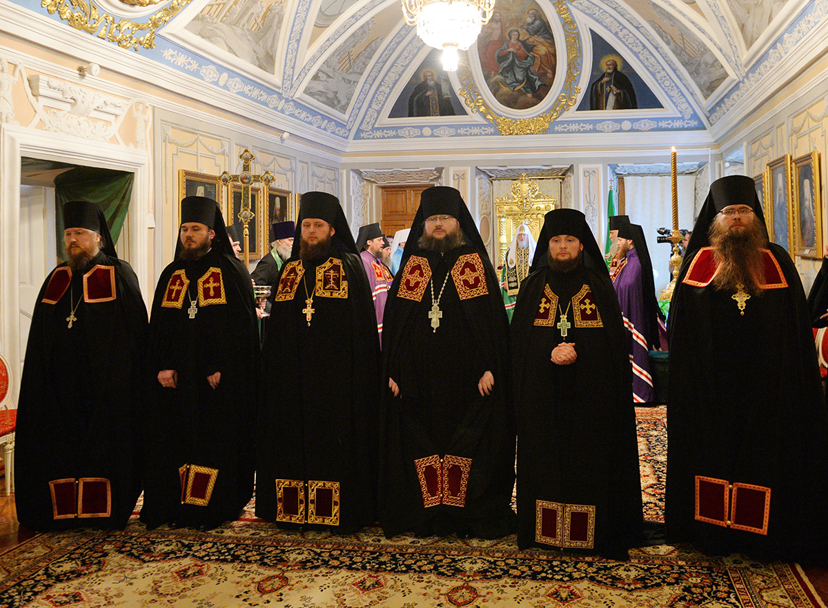 Его Святейшеству сослужили: митрополит Смоленский и Дорогобужский Исидор; архиепископ Верейский Евгений, председатель Учебного комитета Русской Православной Церкви, ректор Московской духовной академии; архиепископ Калининградский и Балтийский Серафим; архиепископ Сергиево-Посадский Феогност, председатель Синодального отдела по монастырям и монашеству, наместник Троице-Сергиевой Лавры; архиепископ Солнечногорский Сергий, руководитель Административного секретариата Московской Патриархии; епископ Воскресенский Савва, первый заместитель управляющего делами Московской Патриархии, наместник Новоспасского ставропигиального мужского монастыря.