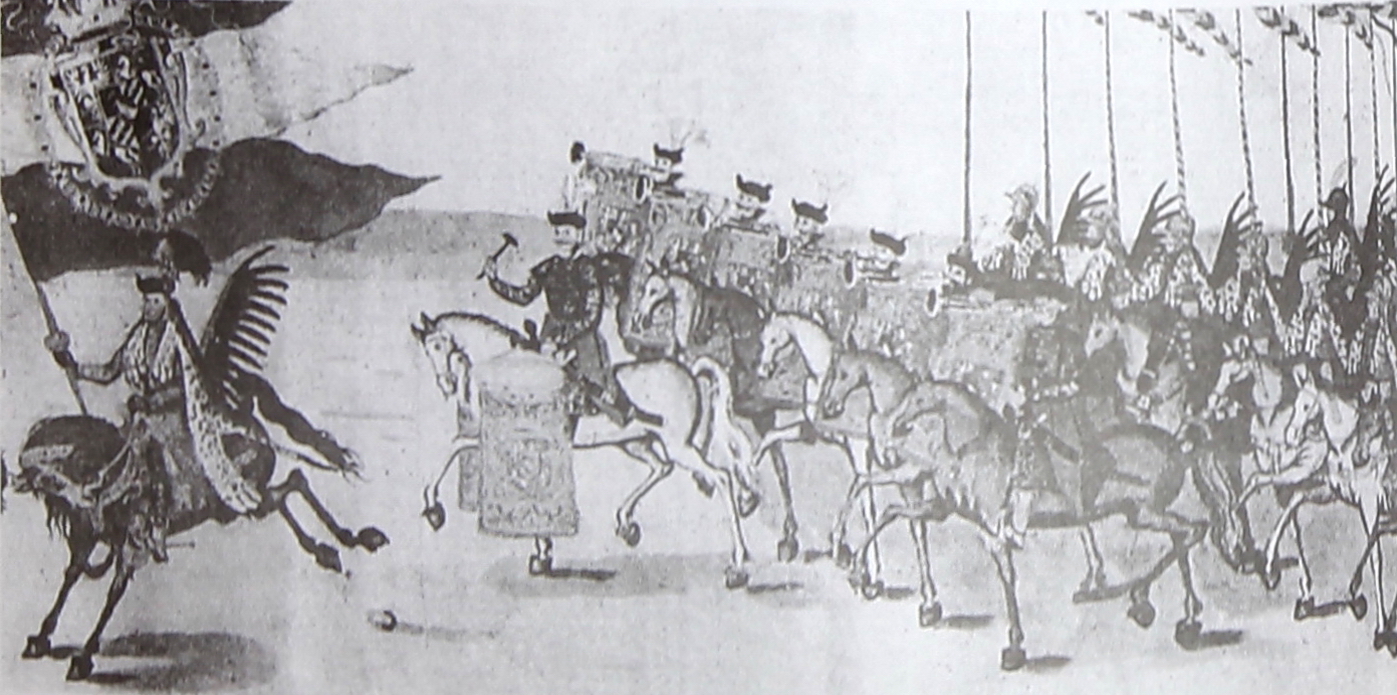 Гусарская хорунга па параде в Кракове по случаю свадьбы Сигизмунда III Вазы с эрц-герцогиней Констанцией. 1605 г. (Королевский замок в Варшаве)