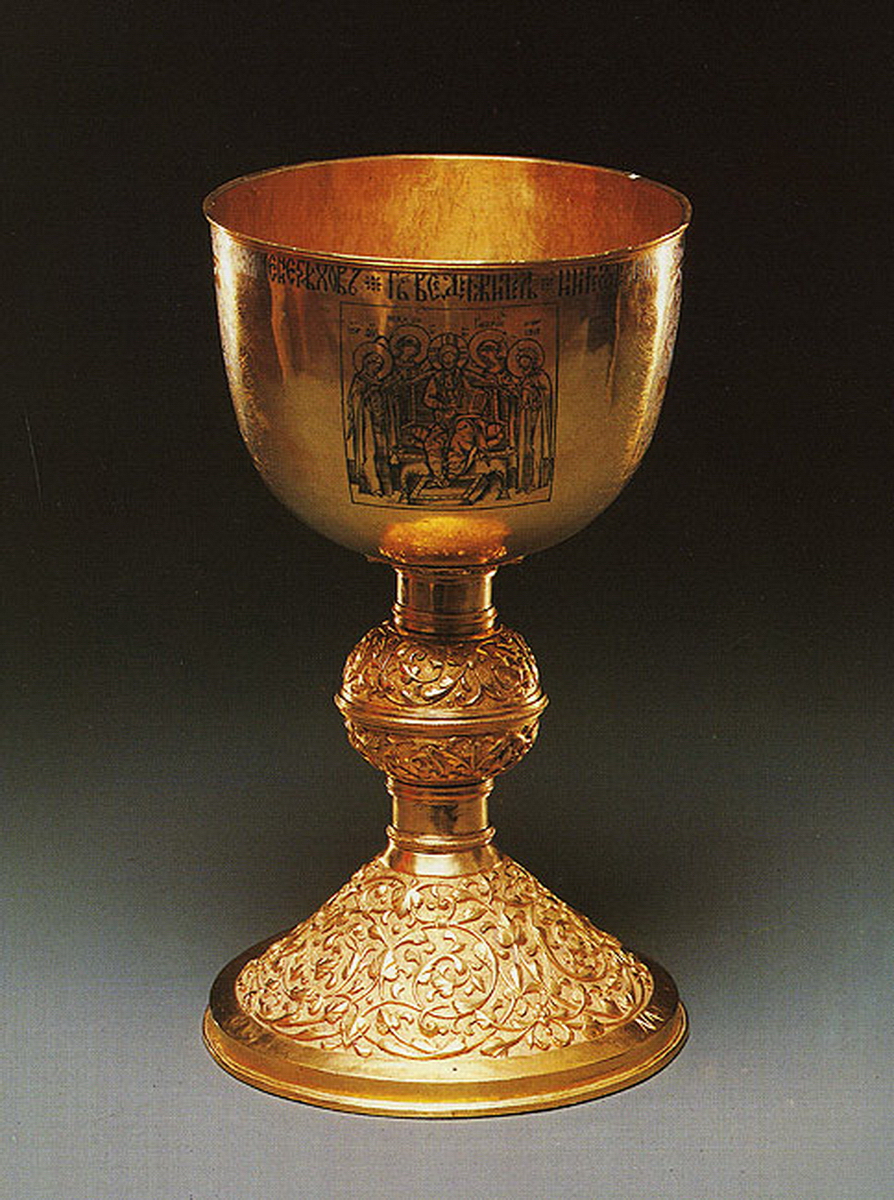 Потир. 1-я пол. XVII о. Работа Ивана Леонтьева. Золото; чеканка, чернь.