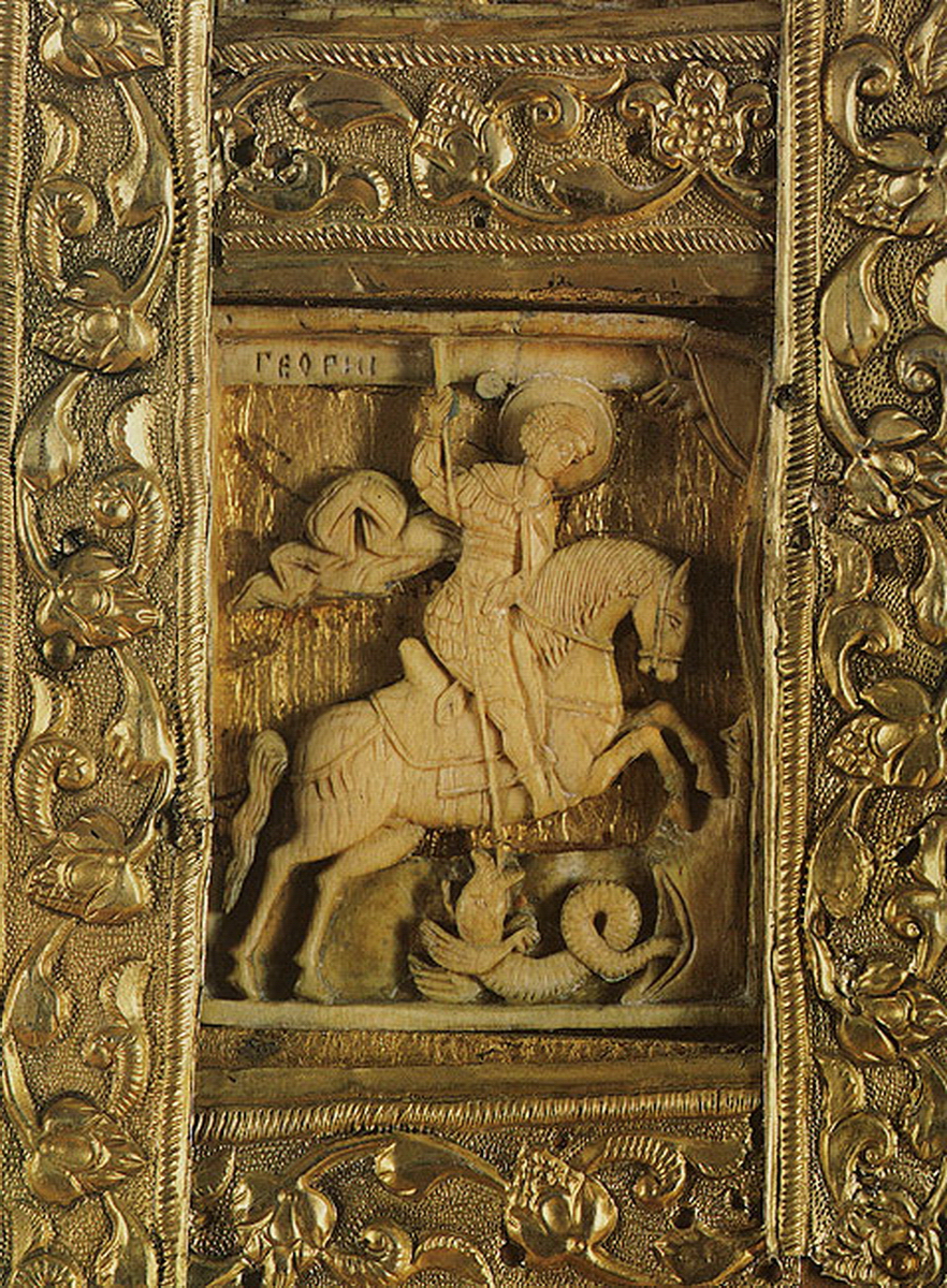 Св. Георгий - “Чудо Георгия о змие”. Фрагмент Запрестольного креста. 2-я пол. XV в.; кость, резьба (Собрание Троице-Сергиева монастыря).