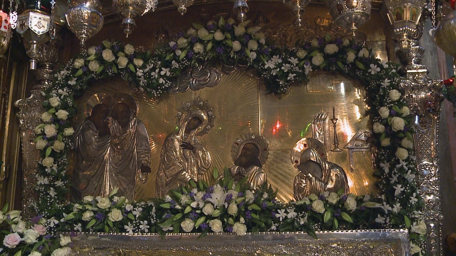В другой раз преподобный Сергий во время молитвы удостоился небесного посещения Самой Пречистой Девы Богородицы, пришедшей к нему со святыми апостолами Петром и Иоанном. Не вынося необычайного сияния, преподобный Сергий пал ниц. Пречистая же коснулась его Своими руками и сказала: «Не ужасайся, избранник Мой! Я пришла посетить тебя, ибо услышаны твои молитвы об учениках. Не скорби больше об обители своей, отныне она будет иметь изобилие во всем не только при твоей жизни, но и по отшествии твоем к Богу. Я же никогда не оставлю места сего». Нам, грешным, трудно и представить себе всю силу молитвы Преподобного, который удостаивался этих небесных видений. Нам трудно и вообразить, как велика, как горяча, как искренна должна быть молитва, за которой следует небесное явление. Для самого Преподобного и для учеников его эти явления были сколько умилительны, столько и неожиданны. Сам Преподобный был долгое время в состоянии высшего духовного озарения, сияя в лице своем особою славою и небесным светом. И всю ночь после видения он оставался в бдении и молитве, прославляя Пречистую за Ее великую милость.