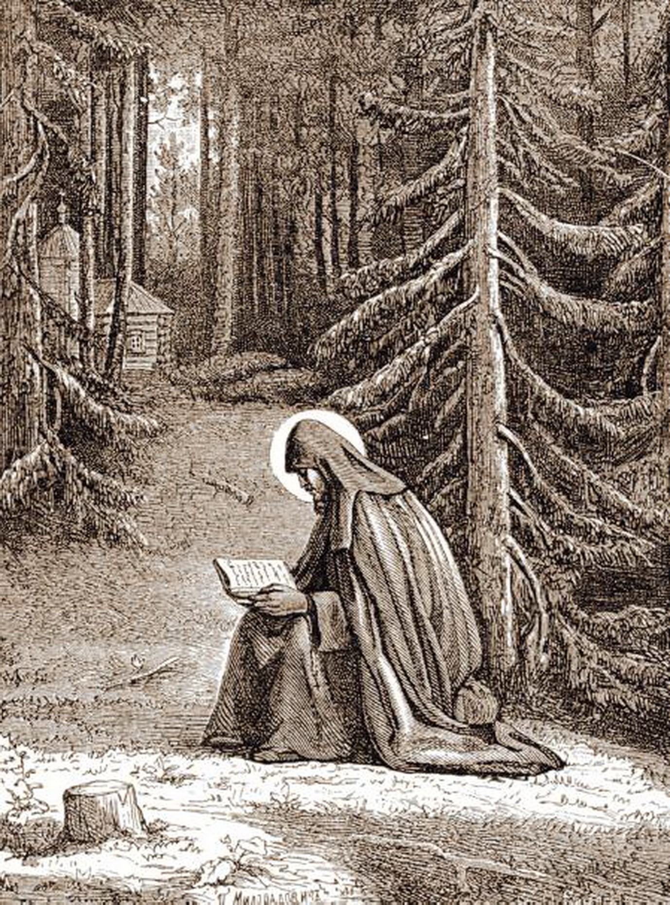 Его ли терпению, когда он живет в лесной чаще, ведет борьбу с злыми духами, переносит лишения и голод? Его ли трудолюбию, когда он сам, игумен, служит братии, носит им воду, дрова, когда за несколько кусков гнилого хлеба строит крыльцо при келии одному из братии? Его ли миролюбию, когда он враждующих князей примиряет и приводит их к повиновению московскому князю? А что сказать о его монашеских, игуменских, священнических подвигах? Сам он как инок подает самый совершенный пример послушания, смирения и нестяжательности.